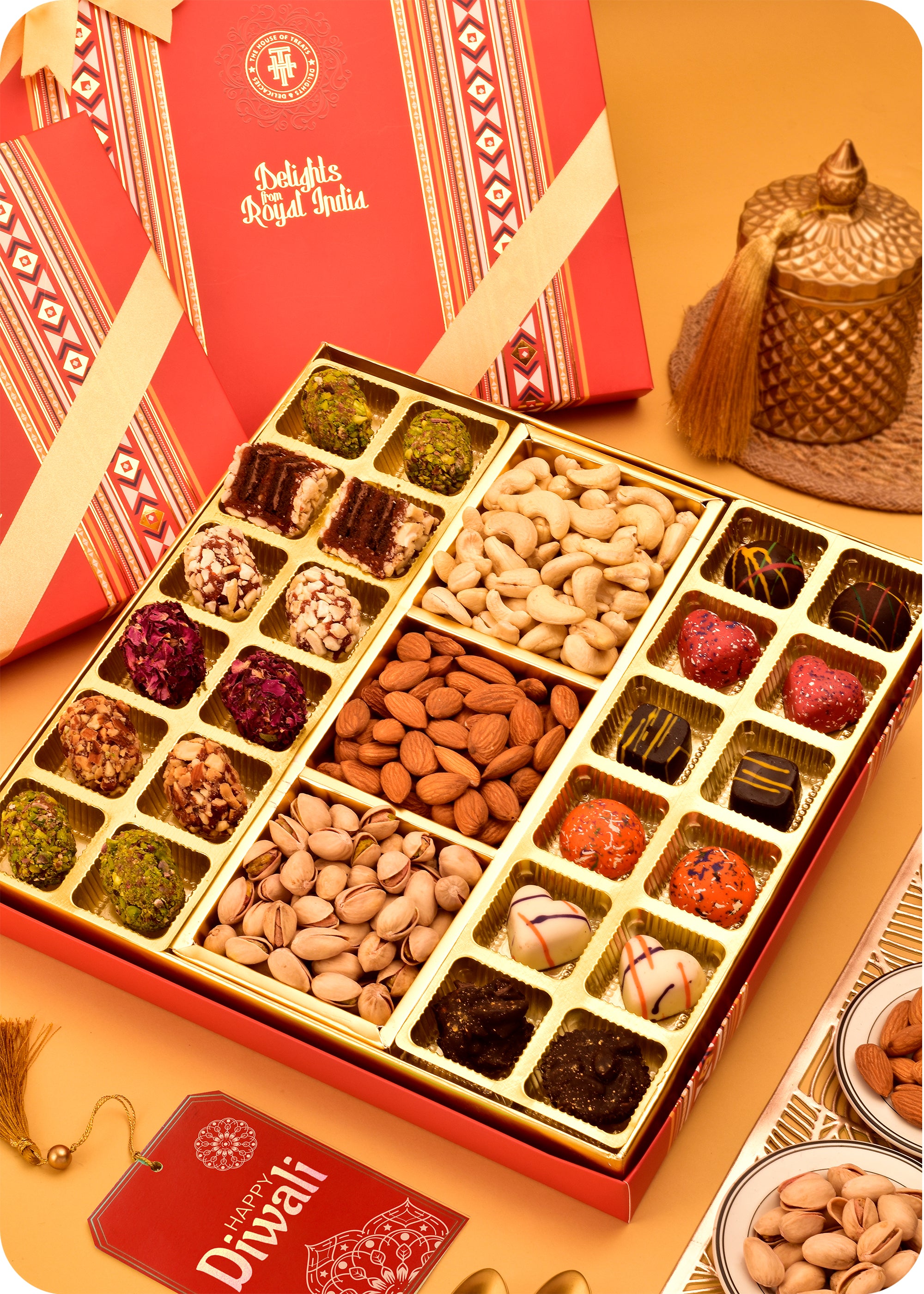 The House Of Treat Box Contains: 2pcs each of Almond Barrel, Rose Barrel, Khajoor Oreo Cake, Cashew Barrel, Pistachio Barrel, Chocolates, Cashew Strawberry Truffle, Dark Truffle Ganache, Orange and Cinnamon, Dark Mandiants, Caramel, Coffee with 75g Cashew, 75g Almond and 60g Pistachios.