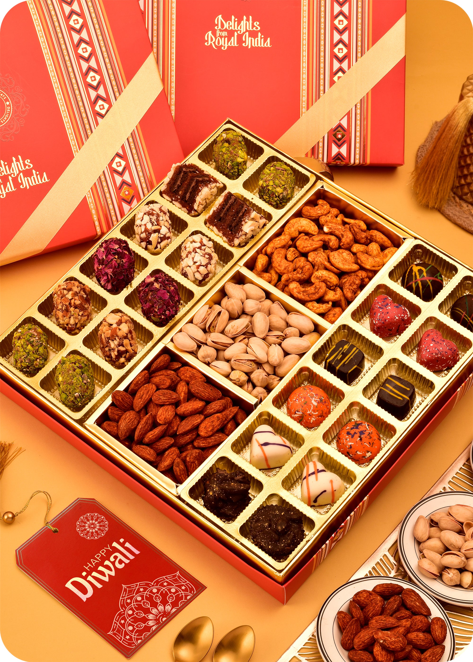 The House Of Treat Box Contains: 2pcs each of Almond Barrel, Rose Barrel, Khajoor Oreo Cake, Cashew Barrel, Pistachio Barrel, Chocolates, Roasted Cashew Strawberry Truffle, Dark Truffle Ganache, Orange and Cinnamon, Dark Mandiants, Caramel, Coffee with 75g Masala Roasted Cashew, 75g Masala Roasted Almond and 60g Masala Roasted Pistachios.