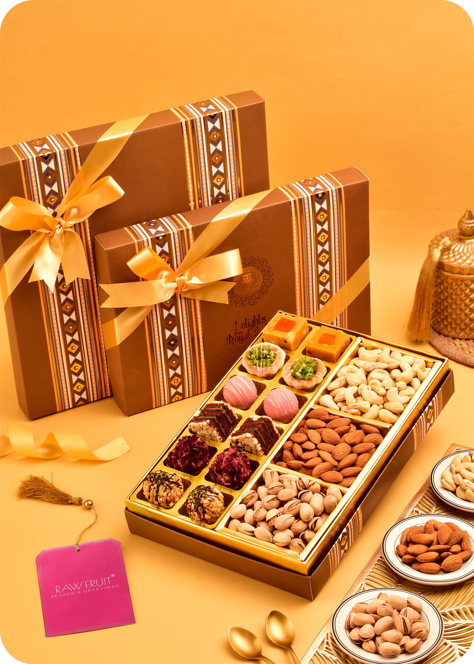 Gift Pack Contains: 2pcs each of Mango Fudge, Kiwi Tart, Strawberry, Khajoor Oreo Cake, Rose Barrel and Ferrero Hazelnut Laddoo with 75g Cashews, 75g Almonds and 60g Pistachios and a Greeting Card.