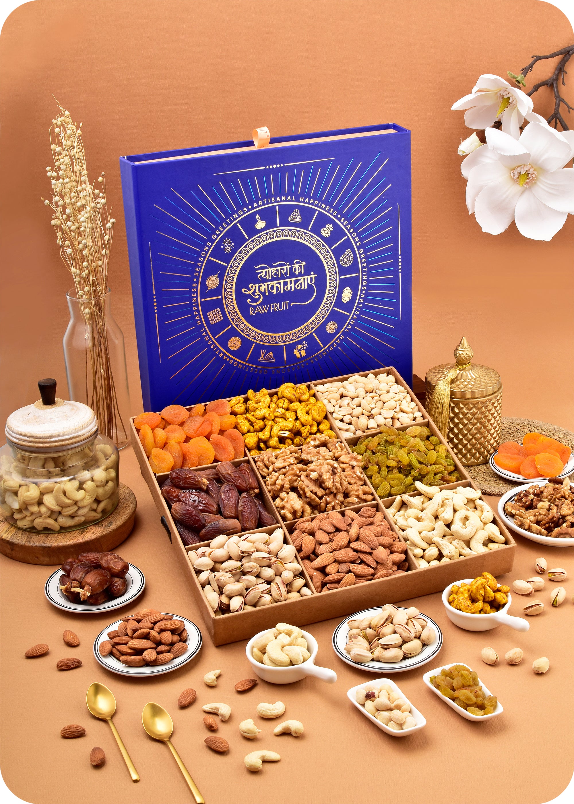 Dry Fruits Gift Pack Contains: 125g Cashews, 125g Almonds, 125g Pistachios, 150g Golden Raisins, 90g Walnuts, 120g Dates, 100g Salted Peanuts, 125g BlackPepper Cashews, 125g Apricots and a Greeting Card.