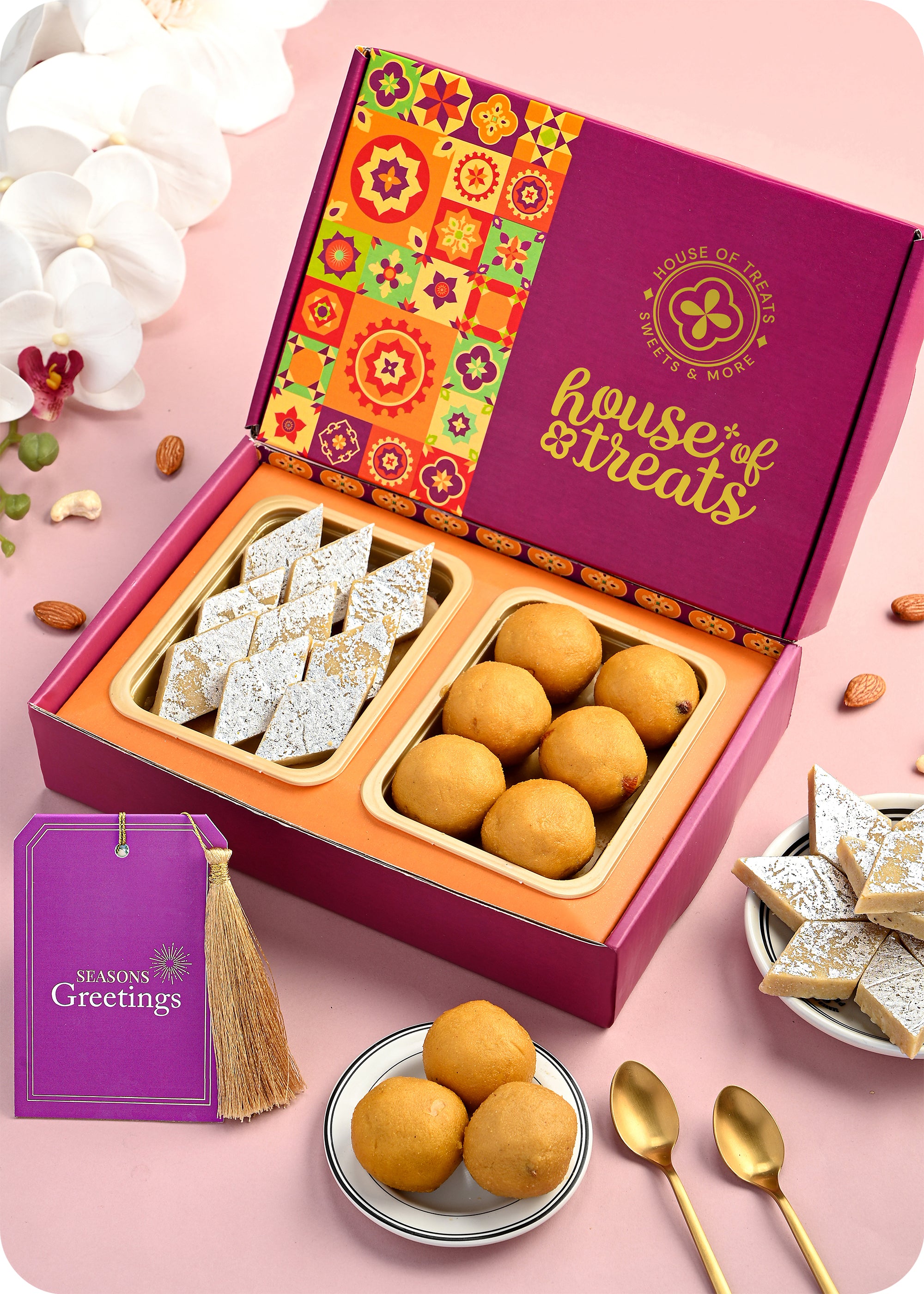 Sweets Gift Pack Contains: 200gm Besan Ladoo, 200gm Kaju Katli and a Greeting Card.