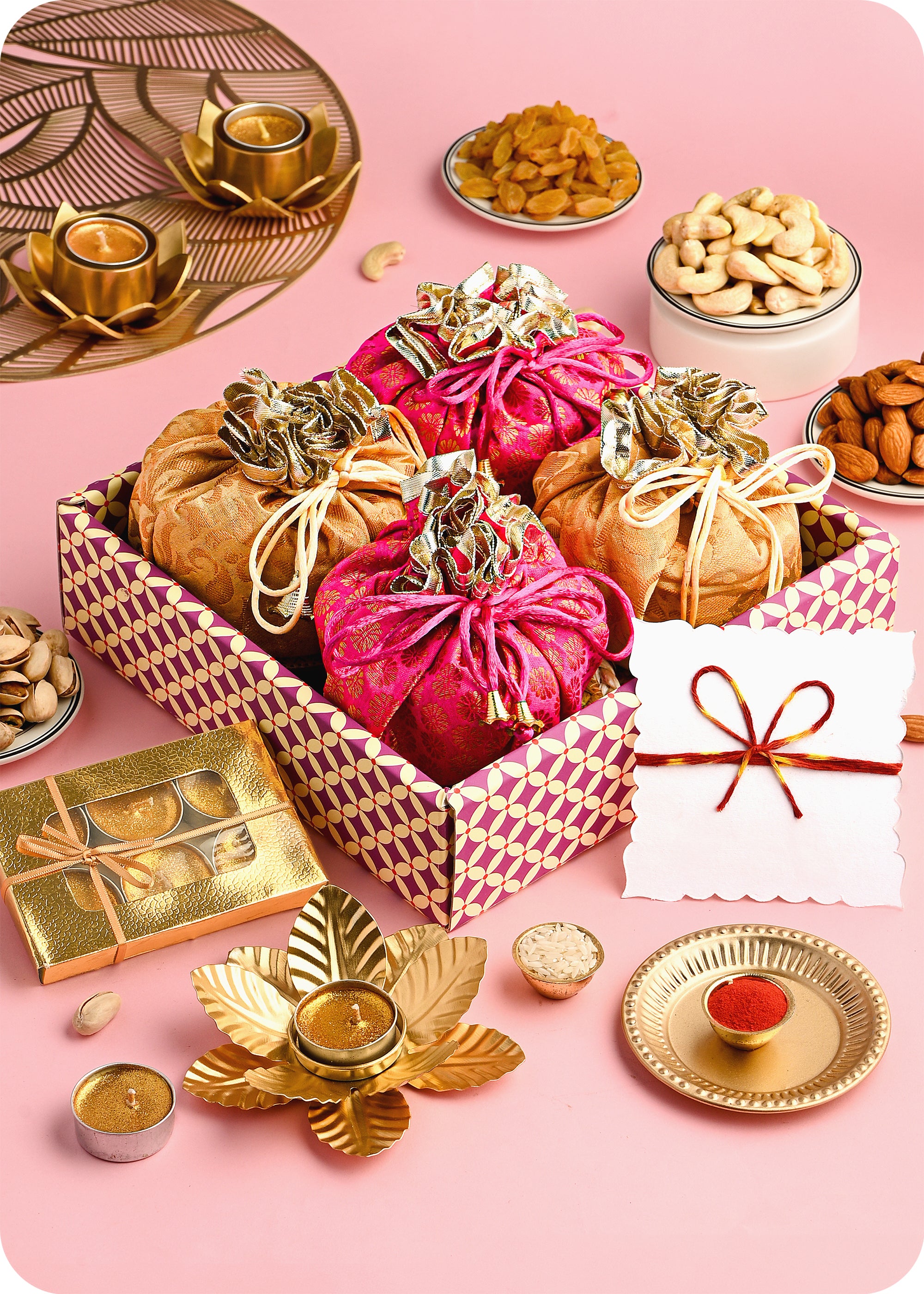 Bhai Dooj Gift Contains: Includes 125gm Cashew, 125gm Almonds, 125gm Raisins, 120gm Pistachio, Pack of 9 Tea Light Candles, A Metal Tea light Holder, Dori, Roli and Rice.