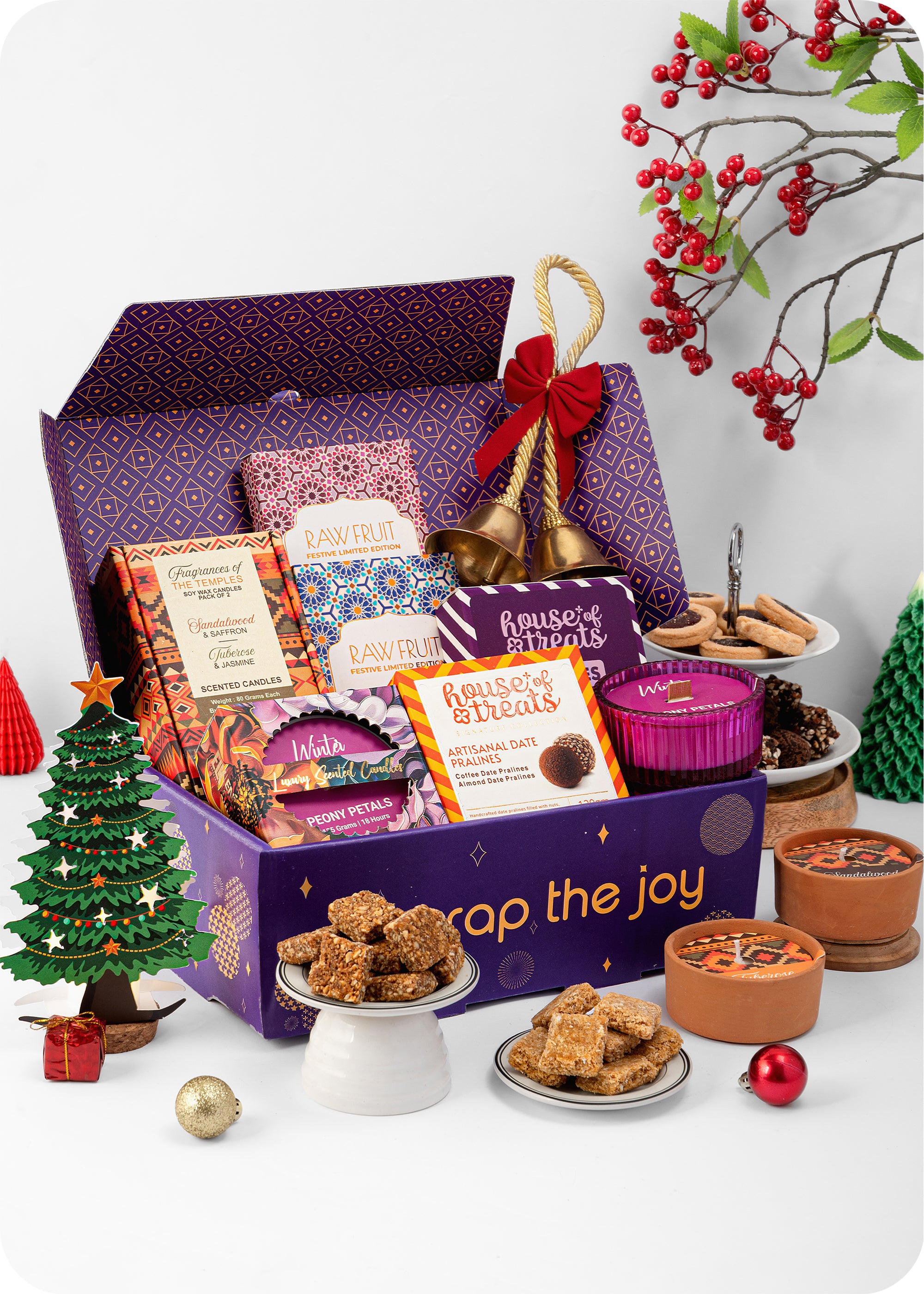 Christmas Gift Hamper Inclusions: Coffee & Almonds Date Pralines 120 Grams, Peanut Crush Brittle 100 Grams, Coconut Crunch Brittle 100 Grams, Blue Berry Jam Cookies 100 Grams, Peony Petal Scented Candles 125 Grams, Fragrances of The Temples Scented Candles Set of 2 - Sandalwood & Saffron and Tuberose & Jasmine 160 Grams, Christmas Bell, DIY Christmas Tree with Electric Tea Light in a Festive Gift Box.