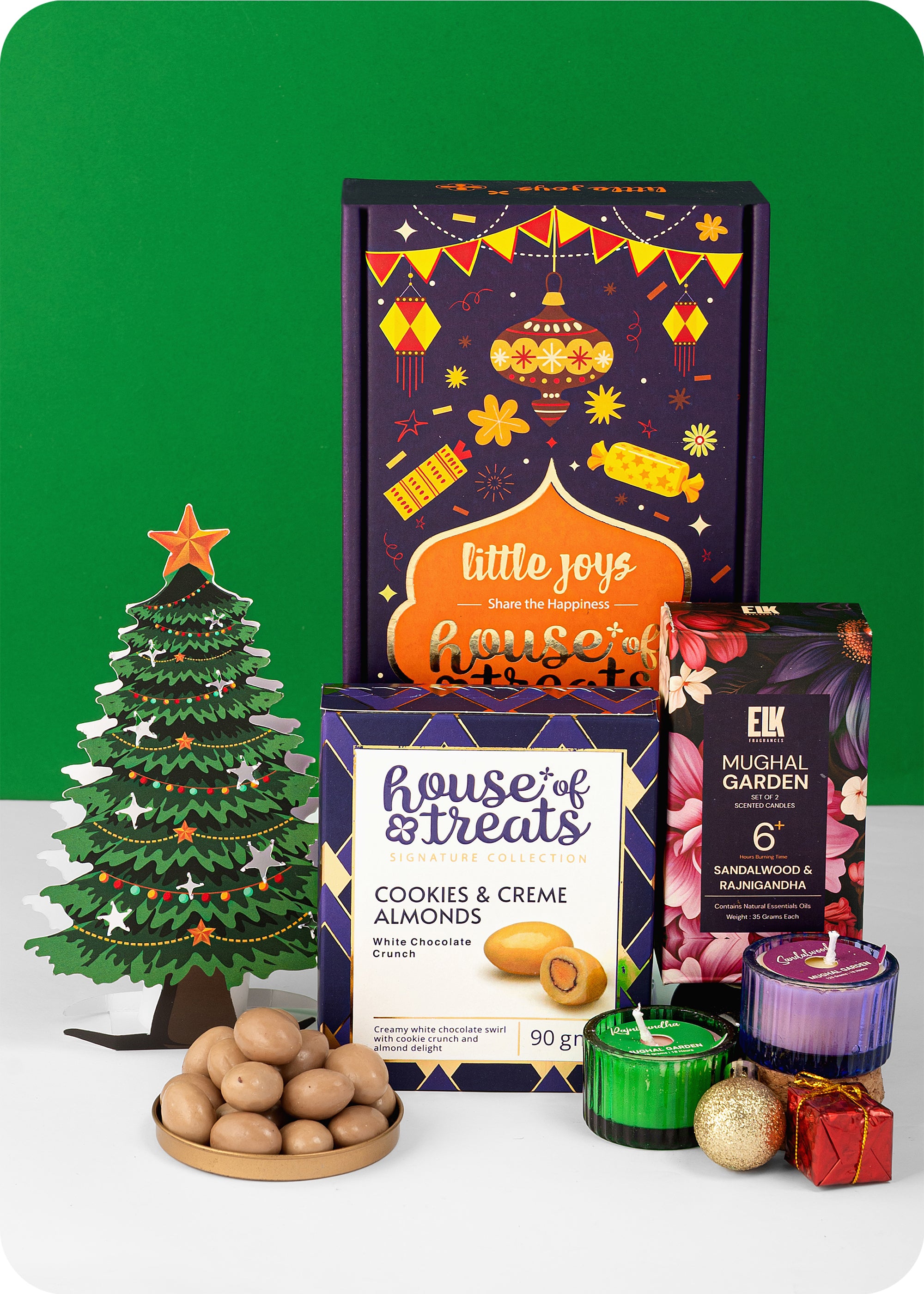 Christmas Gift Hamper Inclusions: Cookies & Creme Almonds Dragees 90 Grams, Mughal Garden Set of 2 Scented Candles - Sandalwood & Rajnigandha, DIY Christmas Tree with Electric Tea Light in a Festive Gift Box.