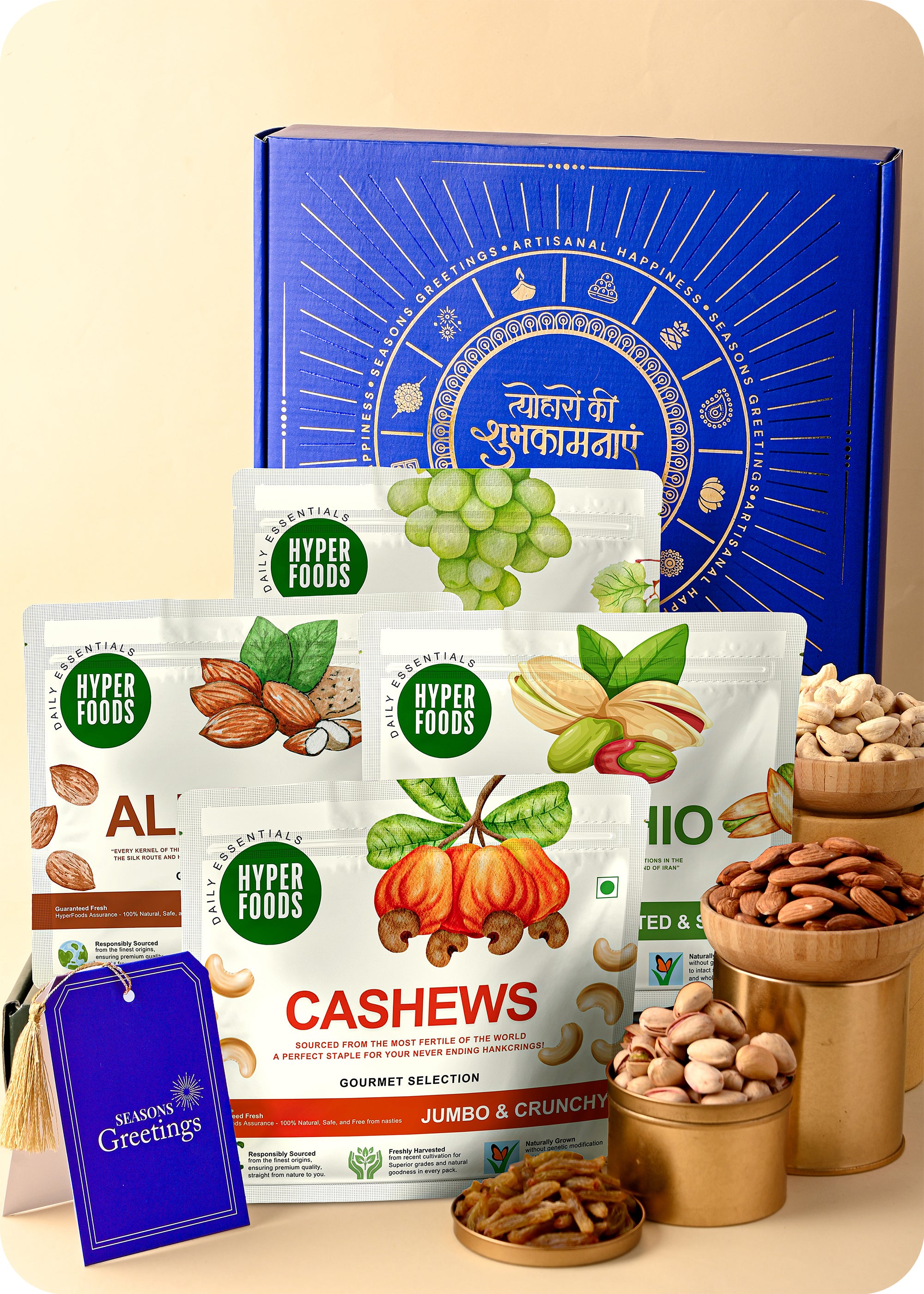 Dry Fruits Gift Box Contains: Cashews 200g, Almonds 200g, Pistachios 200g, Raisins 200g in a Resealable Pouch.
