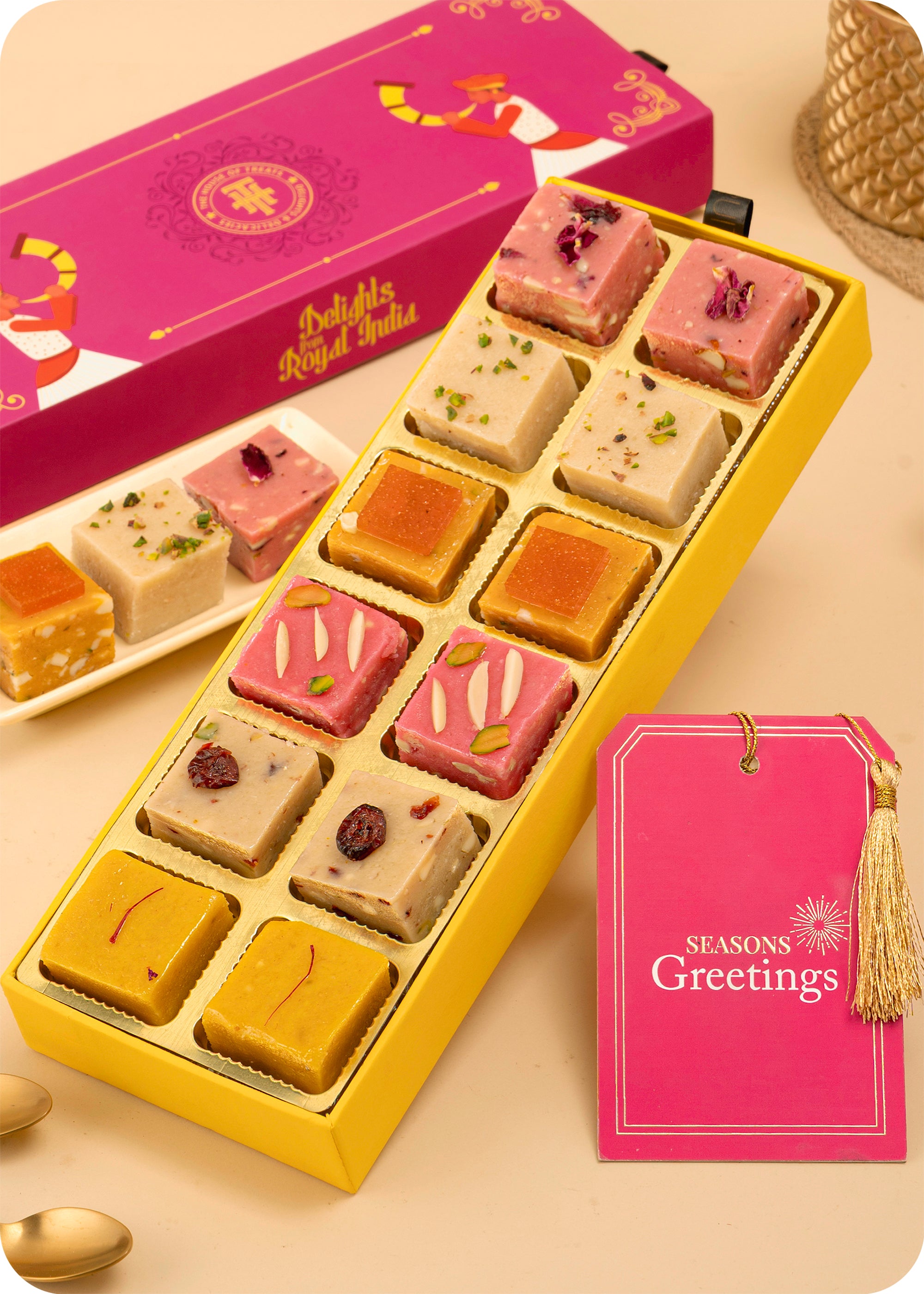 Diwali Sweets Gift Pack Contains: 2pcs Each of Kesar Fudge, Cranberry Fudge, Mango Fudge, Rose Fudge, Strawberry Fudge, Badam Fudge. Our Sweets are 40% More Fresh than your regular Sweets Brand.