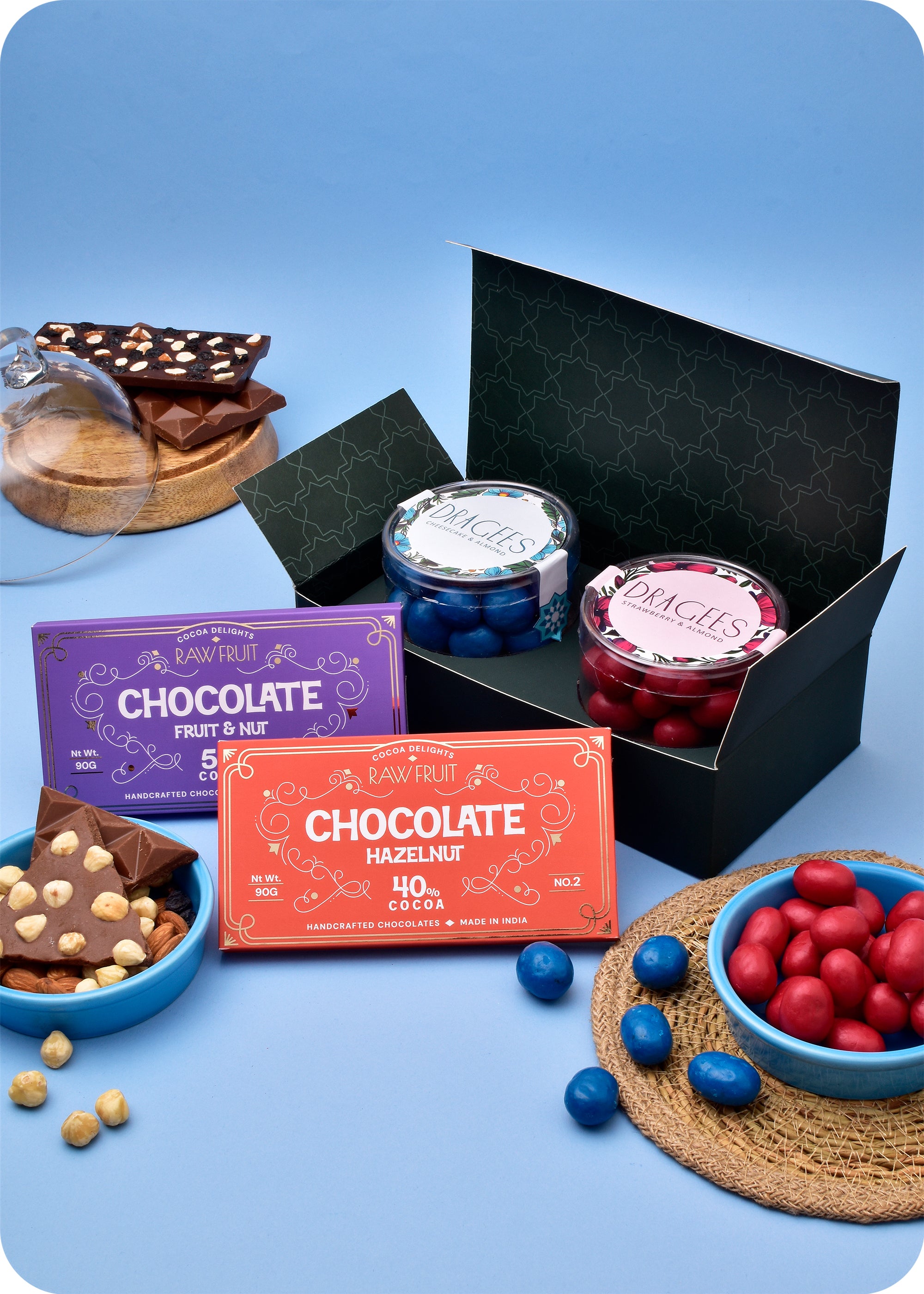 Gift Hamper Contains: CheeseCake Almond Dragee 180g, Strawberry Almond Dragee 180g, Hazelnut Chocolate Bar (1 Unit x 90g) & Fruit & Nut Dark Chocolate Bar(1 Unit x 90g) and a Greeting Card.