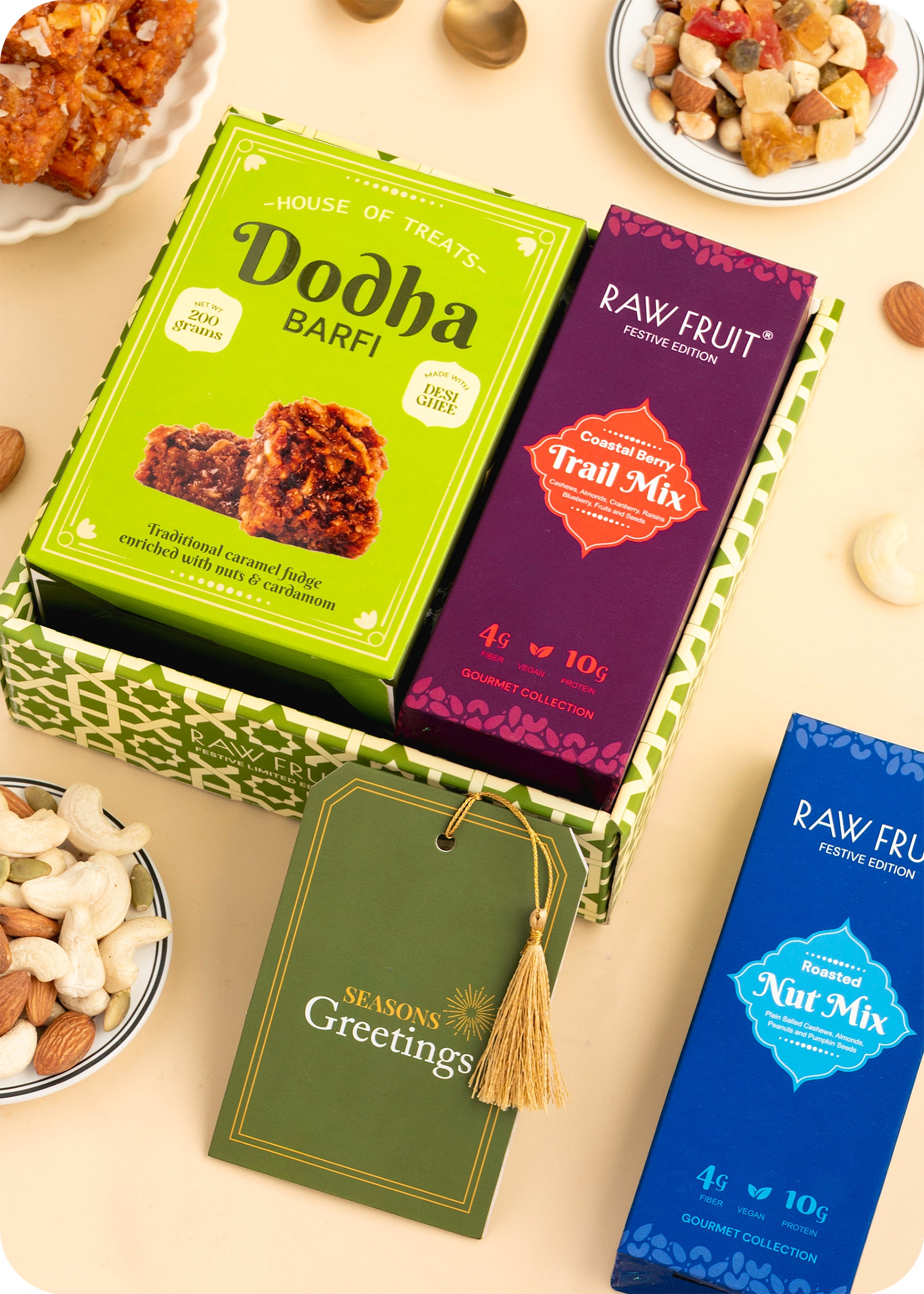 Hamper Gift Pack Contents : Dodha Barfi 200gm, Roasted Nuts Mix 50gm, Coastal Berry Trail Mix 50gm and a Greeting Card.
