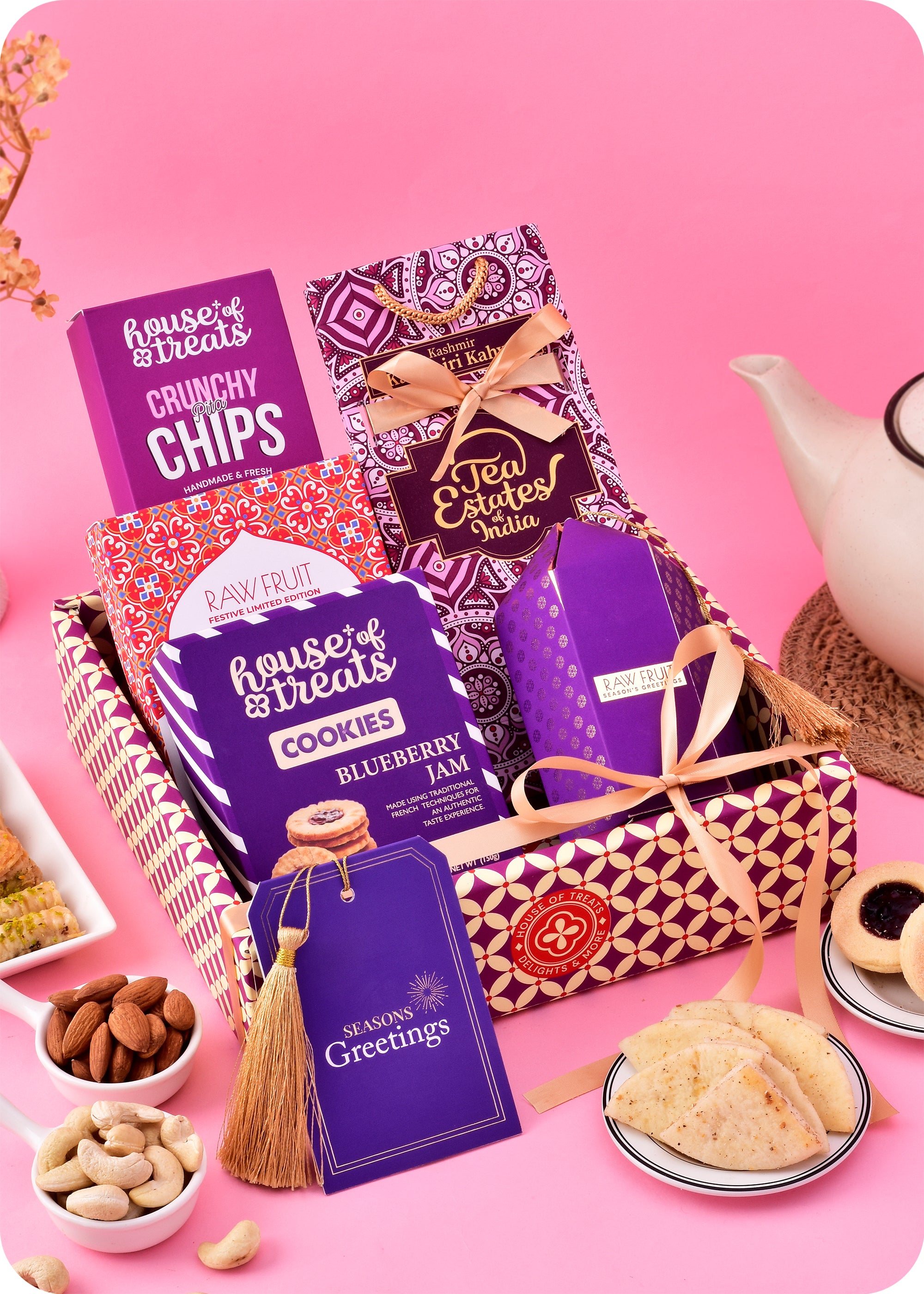 Gift Hamper Contains : Blueberry Jam Cookies 100gm, Turkish Baklawa 100gm, Pita Chips 100gm, Kashmiri Kahwa Tea 50gm, Cashews 50gm, Almonds 50gm and a Greeting Card.