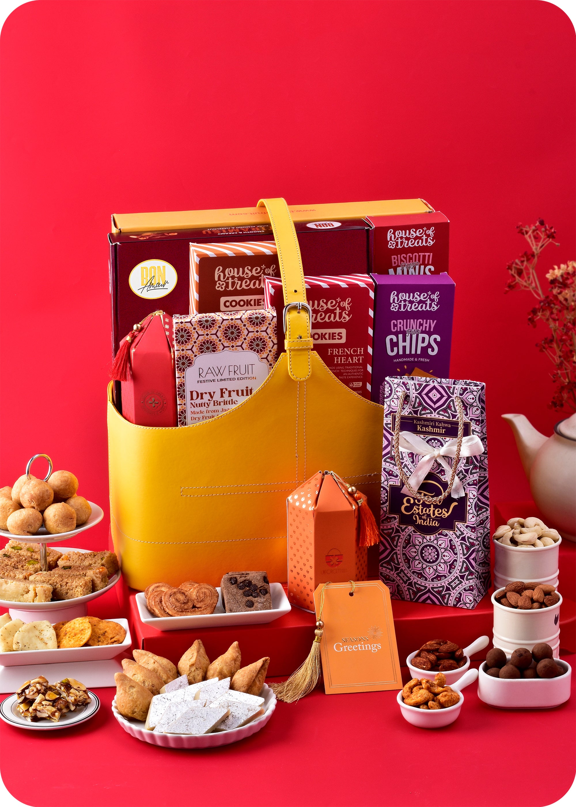 Hamper Inclusions: Kaju Katli & MilkCake (200gm each), Samosa & Kachori (160g each), Pita Chips 100gm, Pizza Minis 100gm, Belgian Chocochips Cookies 150gm, French Hearts Cookies 150gm, Tiramisu Chocolate Box 200gm, Dry Fruits Nutty Brittle 100gm, Cashews 50gm, Almonds 50gm, Roasted Cashews 50gm, Roasted Almonds 50gm, Kashmiri Kahwa Tea 50gm and a Greeting Card.