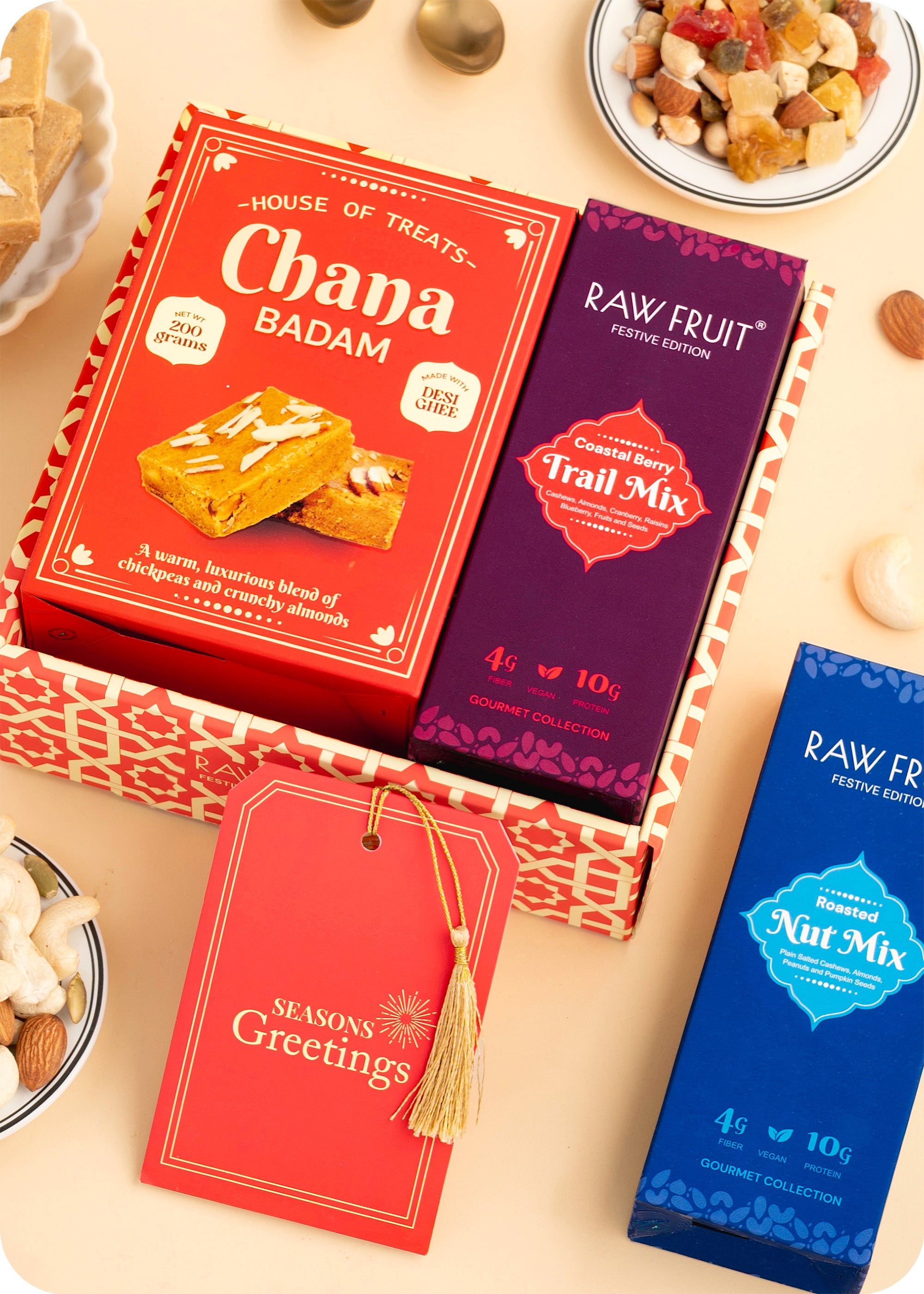 Hamper Gift Pack Contents : Channa Badam Barfi 200gm, Roasted Nuts Mix 50gm, Coastal Berry Trail Mix 50gm and a Greeting Card.