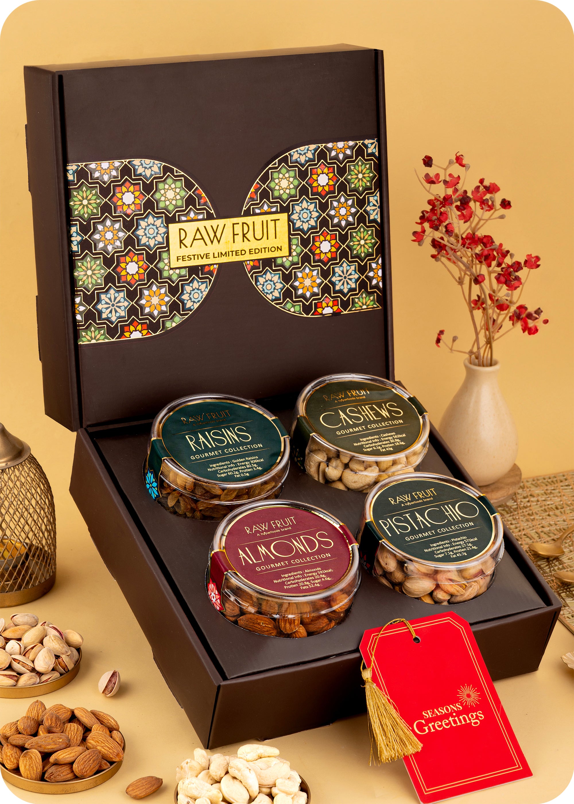 Dry Fruits Gift Box Contains: Cashews 125g, Almonds 125g, Pistachios 120g, Raisins 125g and a Greeting Card.