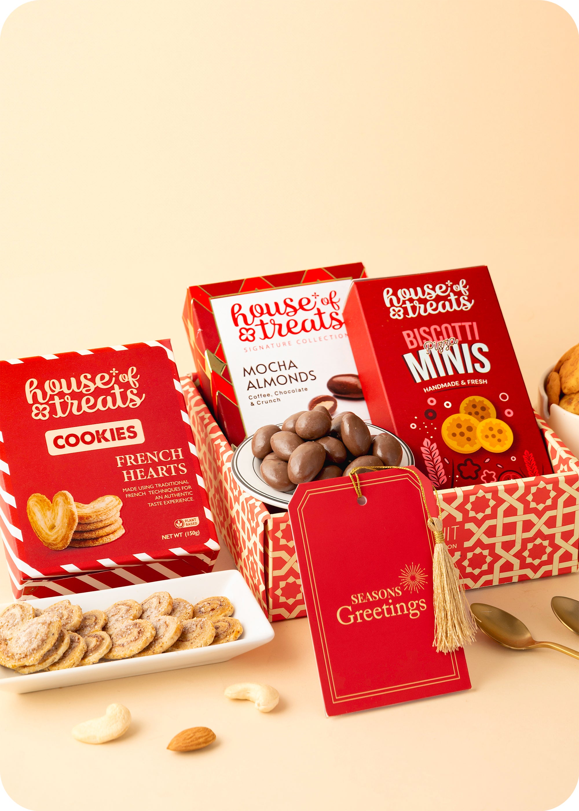 Gift Hamper Contains : French Hearts Cookies 100gm, Biscotti Pizza Minis 100gm, Mocha Almonds 90gm and a Greeting Card.